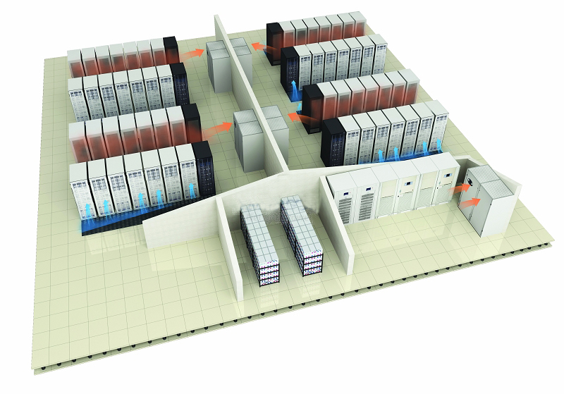 ????? 2、環(huán)境控制系統(tǒng),通常選用機房精密空調(diào)對數(shù)據(jù)中心的環(huán)境調(diào)節(jié),確保服務器等IT設備的運行環(huán)境。對于發(fā)熱量大的服務器等IT設備,通常選用高通孔率(一般大于70%)網(wǎng)孔門的機柜,提高機柜進出風量;將機柜面對面、背對背布置,在機房內(nèi)形成冷熱隔離的風道,提高制冷效率;空調(diào)采用下送風方式,確保機房送風均勻,提高制冷效率。
