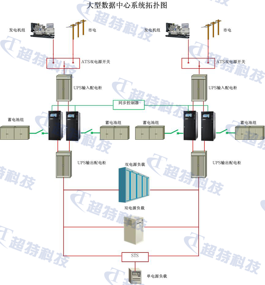 ??????1、電源系統(tǒng),通常選用多路市電源互為備份,并且機房設有專用柴油發(fā)電機系統(tǒng)作為備用電源系統(tǒng),市電電源間、市電電源和柴油發(fā)電機間通過ATS(自動切換開關(guān))進行切換,為數(shù)據(jù)中心內(nèi)UPS(不間斷供電電源)、機房空調(diào)、照明等設備供電。由于大型數(shù)據(jù)中心業(yè)務重要性,通常采用雙母線的供電方案供電,滿足大型數(shù)據(jù)中心服務器等IT設備高可靠性用電要求。雙母線供電系統(tǒng),有兩套獨立UPS供電系統(tǒng)(包含UPS配電系統(tǒng)),在任一套供電母線(供電系統(tǒng))需要維護或故障等無法正常供電的情況下,另一套供電母線仍能承擔所有負載,保證機房業(yè)務供電,確保數(shù)據(jù)中心業(yè)務不受影響。在UPS輸出到服務器等IT設備輸入間,選用SPM(服務器電源管理器)進行電源分配和供電管理,實現(xiàn)對每臺機柜用電監(jiān)控管理,提高供電系統(tǒng)的可靠性和易管理性。對于雙路電源的服務器等IT設備,直接從雙母線供電系統(tǒng)的兩套母線引人電源,即可保證其用電高可靠性。對于單路電源的服務器等IT設備,通常選用STS(靜態(tài)切換開關(guān))為其選擇切換一套供電母線供電。在供電母線無法正常供電時,STS將自動快速切換到另一套供電正常的母線供電,確保服務器等IT設備的可靠用電。