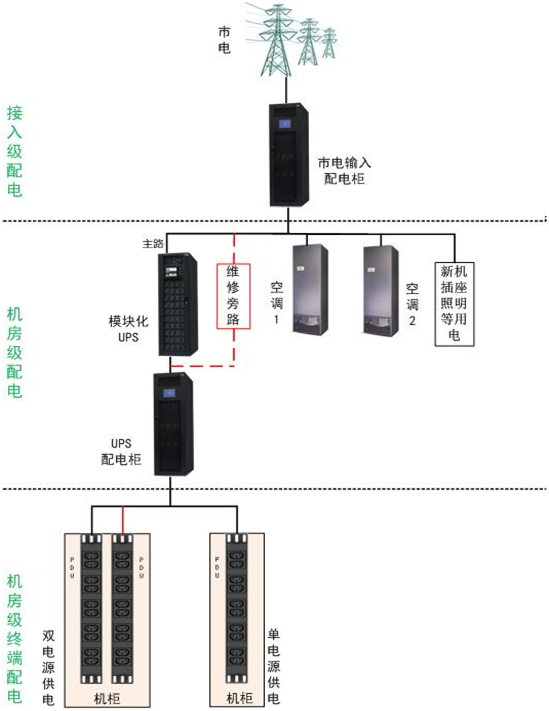 C級(jí)(基本級(jí))供配電系統(tǒng):按中小型數(shù)據(jù)中心業(yè)務(wù)性質(zhì),可選用C級(jí)(基本級(jí))供配電系統(tǒng),滿足中小型數(shù)據(jù)中心IT設(shè)備可靠性用電要求。采用單路市電電源為數(shù)據(jù)中心機(jī)房UPS(不間斷供電電源)、機(jī)房空調(diào)、新風(fēng)、照明、維修插座等設(shè)備供電。市電電源正常運(yùn)行情況下,保證機(jī)房設(shè)備運(yùn)行不中斷。